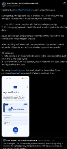 geneva_convenience@lemmy.ml to Privacy@lemmy.ml · 8 hours agoNew EU age verification app hack speedrun recordplus-squarelemmy.mlimagemessage-square22linkfedilinkarrow-up1420arrow-down12