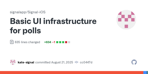arrow-up11arrow-down1external-linkLooks like Signal is working on implementing pollsplus-squaregithub.comteolan@lemmy.worldEnglish · edit-26 months agomessage-square0linkfedilink