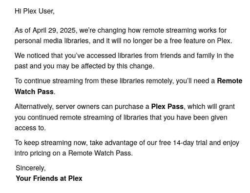 In short, I don’t care how you justify it. Plex is doing something shitty. They’re removing functionality that has been free for years. I’m not responding to any more of your comments repeating the same arguments over and over.