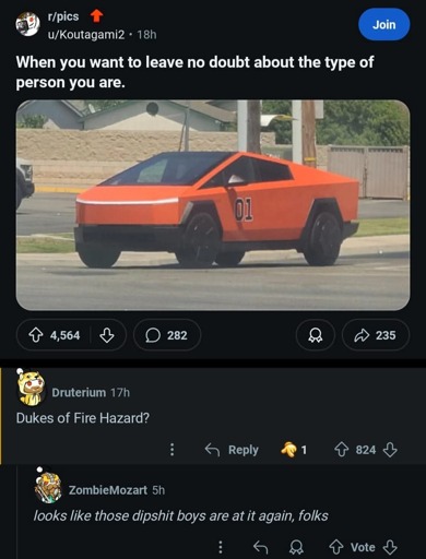minus-squareflandish@lemmy.worldlinkfedilinkarrow-up17arrow-down1·7 months agothey are shit trucks owned by people who are ok supporting a nazi. making the owners, themselves, pieces of shit.