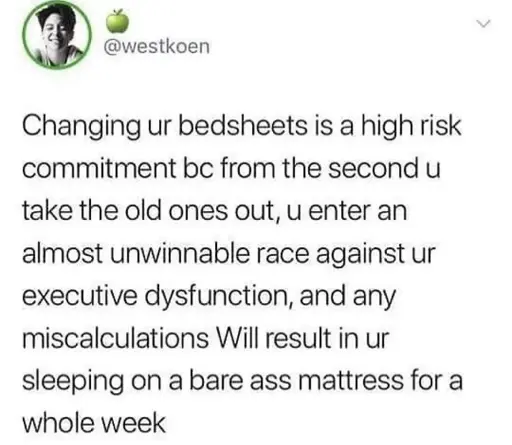 Stamets@lemmy.dbzer0.com to ADHD memes@lemmy.dbzer0.comEnglish · 1 month agoBedsheetslemmy.dbzer0.comimagemessage-square82linkfedilinkarrow-up1784arrow-down117