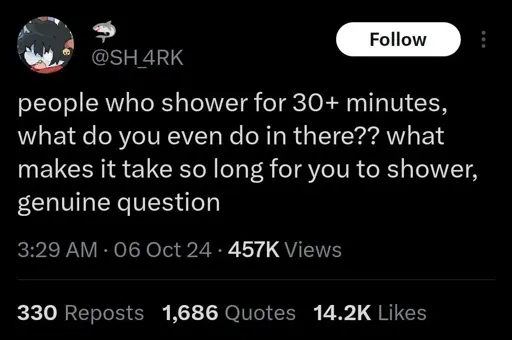 It’s not a fucking speedrun homie. This isn’t shower any%. I’m usually listening to music and enjoying the hot water. Plus if it’s a wash day, washing and conditioning long hair takes a while.