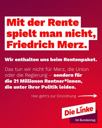 Linke Socke@feddit.orgM to DIE LINKE@feddit.org · 29 days agoWarum die Linke sich enthalten wird. Rentenpaketfeddit.orgimagemessage-square5linkfedilinkarrow-up143arrow-down12file-text