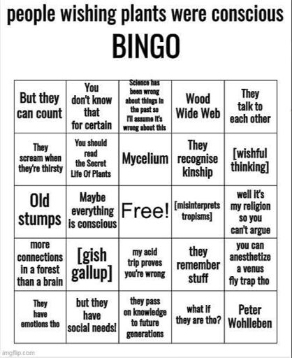 That could literally be an alternate title for the bingo card, and is almost certainly the motivation for like 90% of the people who wish plants were conscious. And even if their flawed logic were true, it’s just more testament to how morally bankrupt they are. Because all they’re saying is “since we might be causing suffering on an incomprehensibly massive scale in this hypothetical case, that means it’s perfectly fine to also keep causing suffering on an incomprehensibly massive scale in this other case where it for sure is happening undeniably. Gotcha, vegan!”
