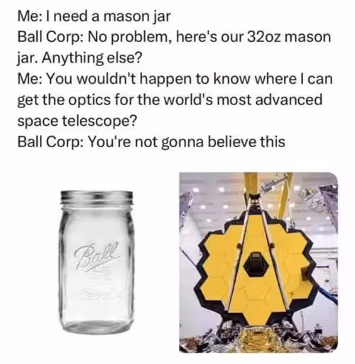 Funnily, they no longer make either of these products. The glass jar division was sold decades ago, and the aerospace sector was purchased by BAE last year. Ball is still the largest manufacturer of aluminum cans, however. They also make plastic bottles.