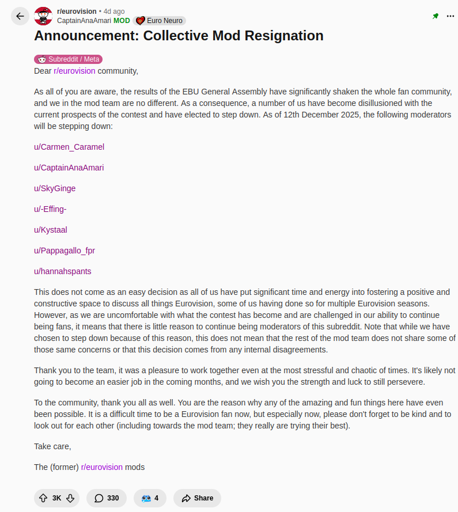 geneva_convenience@lemmy.ml to Reddit@lemmy.world · 11 days agoMultiple r/eurovision mods resign as protest against Israeli participation in the contest.lemmy.mlimagemessage-square8linkfedilinkarrow-up1128arrow-down11file-text