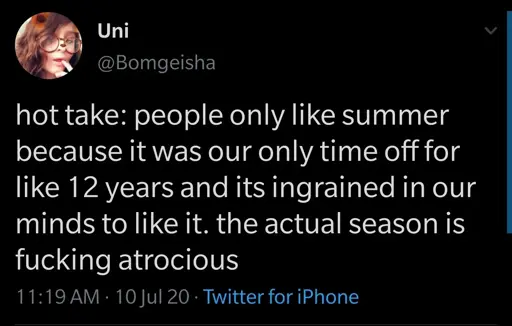 You know that scene from riddick where the guy steps into the sun/desert storm and gets instantly vaporized? Thats what its like here in the summer. Every year my state sends everyone a letter telling them basically not to go outside. Winters are aight, they get a little cold. Coldest i can remember was about -10f or im guessing about -14C