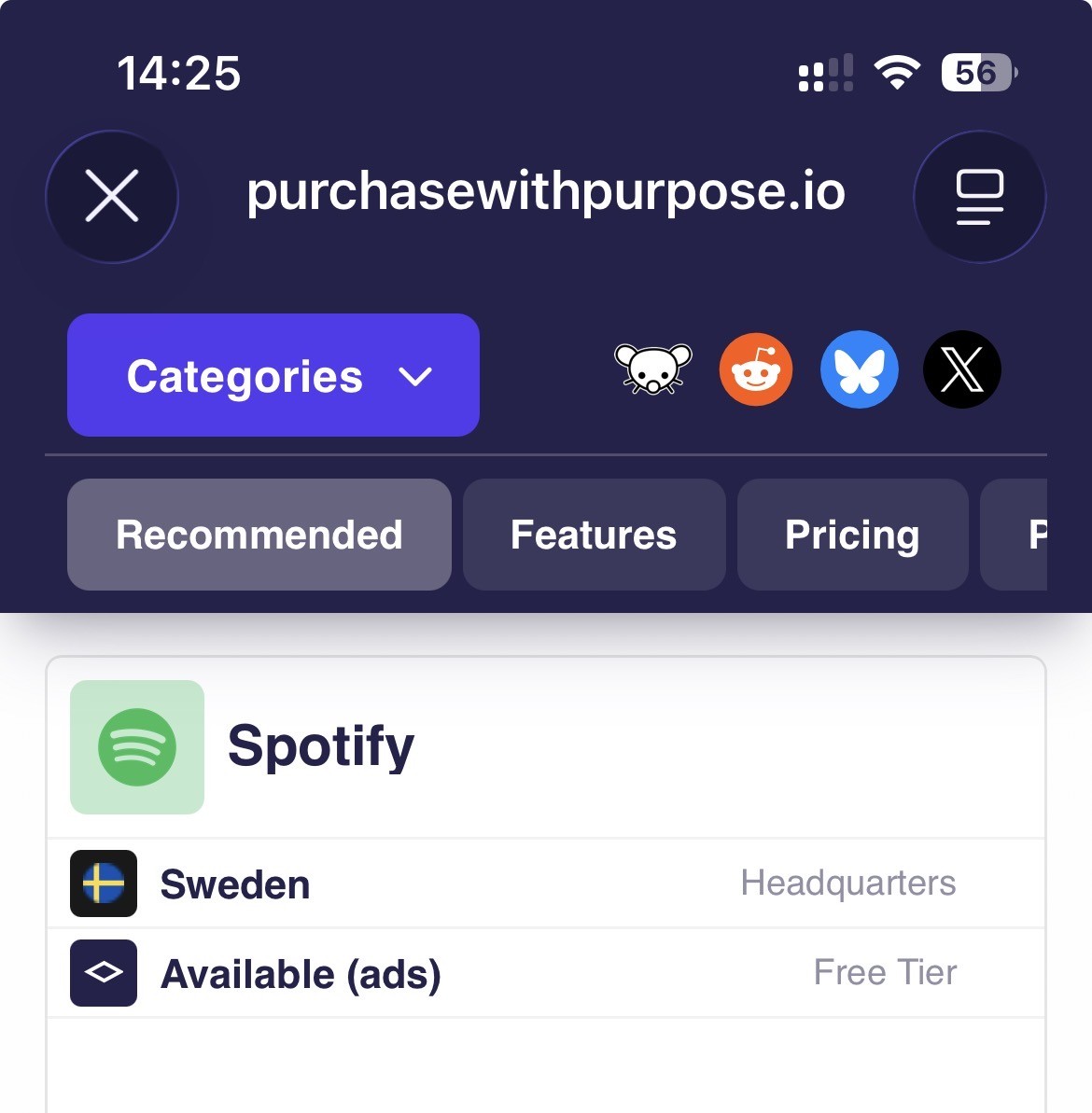 Spotify is an alternative, but it doesn’t come recommended (in the guide or the website) and has a huge disclaimer to their name. https://purchasewithpurpose.io/software/D5JUoM1dZysf7JJgTAWXy/