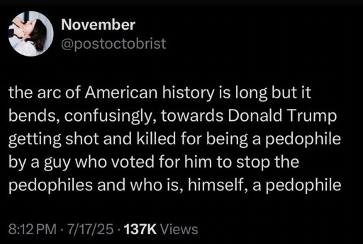 The system isn’t being upheld at the highest levels because politicians feel like the average American voter feels disconnected from politics. So this means the Epstein files could have 4k video of Trump doing the acts people accuse him of and it won’t matter. Whatever happens from here on out, unless there’s a massive social disruption that hurts a lot of people in some way, physically or economically, there will be no consequence broadly. Maybe some mid-level stooges will go through some show-trials.