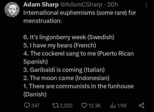minus-squareLund3@sh.itjust.workslinkfedilinkarrow-up4·2 days agoThe Danish one is true at least. Its quite a common phrase.