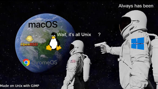 Alt text: meme with the ‘Always has been’ format Linux, MacOS, OpenBSD and ChromeOS logos on top of the Earth The first astronaut says ‘Wait, it’s all Unix?’ A Windows logo, on top of the second astronaut. The second astronaut says ‘Always has been’ and points a gun to the first astronaut.