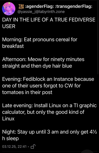 Samskara@sh.itjust.works to Fediverse memes@feddit.ukEnglish · 2 months agoDay in the Life of a True Fediverse Usersh.itjust.worksimagemessage-square129linkfedilinkarrow-up1694arrow-down136