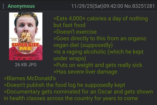 🍹Early to RISA 🧉@sh.itjust.worksM to Greentext@sh.itjust.works · 10 days agoAnon watches Super Size Mesh.itjust.worksimagemessage-square82linkfedilinkarrow-up1502arrow-down121