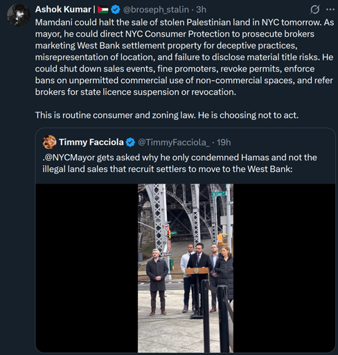 Yeah… I’m not convinced the mayor of NYC can feasibly stop the sale of property in Israel.