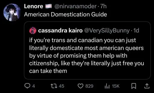 Memeing about the shitty situation of queer people in the USA, as in it’s so bad they’d rather become even pets to get into the safety of Canada.