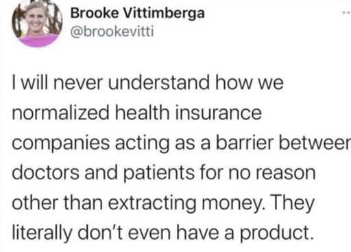 Even though insurance companies are literally already between you and your doctor, and they exist purely to extract money from that interaction.