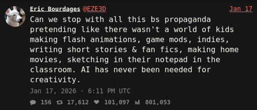 ThefuzzyFurryComrade@pawb.socialM to Fuck AI@lemmy.world · 24 days agoOn the Nessecity of 'AI' for Creativitypawb.socialimagemessage-square32linkfedilinkarrow-up1604arrow-down111file-text