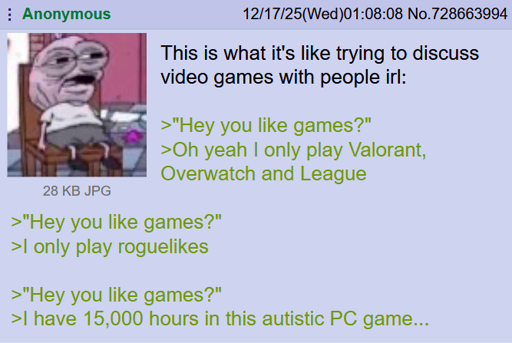 arrow-up1736arrow-down1imageAnon wants to talk about video gamessh.itjust.works🍹Early to RISA 🧉@sh.itjust.worksM to Greentext@sh.itjust.works · 13 days agomessage-square237linkfedilink