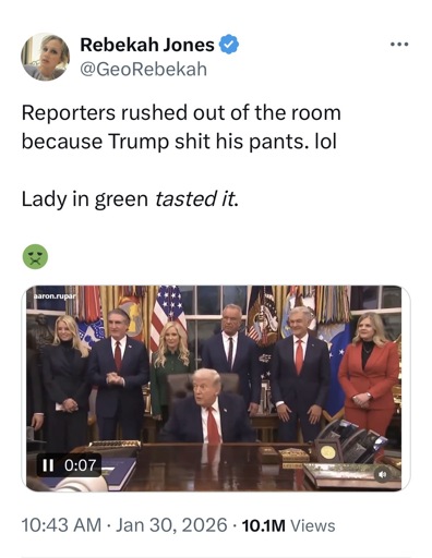Posting a possible explanation behind an Oval Office event ending abruptly, she said, in what appeared to be sarcasm, that Trump ‘pooped his pants’.