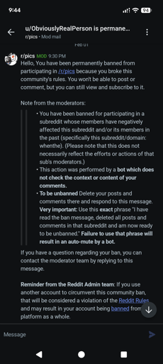 HappySkullsplitter@lemmy.world to Reddit@lemmy.world · 1 month agoGetting banned from r/pics randomlylemmy.worldimagemessage-square22linkfedilinkarrow-up199arrow-down13file-text