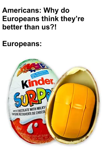 In the US though you’re not allowed to include toys inside the chocolate because “choking risk.” We all think it’s dumb too but honestly it just seems like we constantly have more important shit to care about, we’re not taking to the streets for some chocolate eggs.