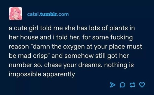 Nothing about this is strange. Oh, someone made a weird comment about my oxygen content! Oh, maybe that person thinks I have real plants in my place!? What do? Fuck that person. Literally, have sex with them.