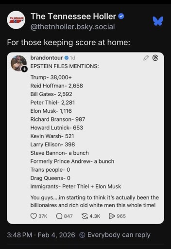 The bottom ones are not hyperbolae, they are “found evidence in the files released.” With the current administration I think it’s safe to assume if a transperson or drag queen were in them they would’ve been unredacted and released as early as possible to distract from the rest of it, let alone all the people also combing what was released.