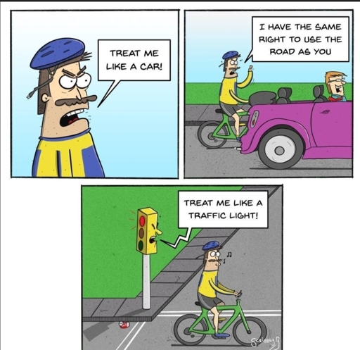 I’ve been the car driver who nearly made jam out of the cyclist in the last panel. I’ve also been the cyclist hit by a car which was driving in the cycle lane.