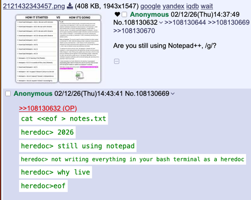 arrow-up1218arrow-down1imagewhat kind of a n00b uses a text editor to edit textlemmy.worldkali_fornication@lemmy.world to linuxmemes@lemmy.world · 6 days agomessage-square20linkfedilink