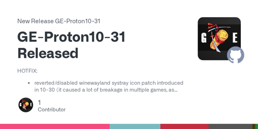 - reverted/disabled winewayland systray icon patch introduced in 10-30 (it caused a lot of breakage in multiple games, as well as breaking in gamescope session on steam deck. no bueno.)