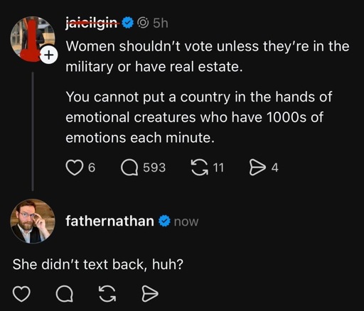 minus-squareBroadfern@lemmy.worldlinkfedilinkEnglisharrow-up28·19 days agoGreat news! Before the age of 18, they’re not women.