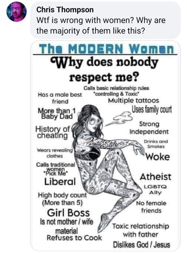 But when combined with the other half it’s describing a very specific type of woman who her self is a massive red flag and a shitty person.