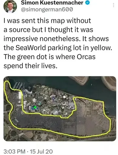 Not that it matters too much to the point they are trying to make, but they didn’t highlight the entire orca area either. So an over representation for the parking lot and under for the actual exhibit surface area.