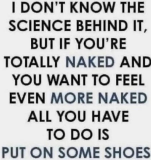 minus-squarecloudskater@piefed.blahaj.zonelinkfedilinkEnglisharrow-up10·6 days agoThe shoes stay on during sex.