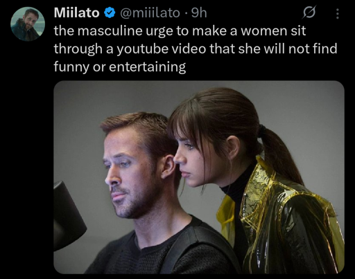 And at the same time either aggressively or passive aggressively making it clear to him that she is disinterested in the video, which is reinforcing the man’s understanding that she is also disinterested in whatever it was that he found interest in. (That’s literally the whole subtext of the meme.)