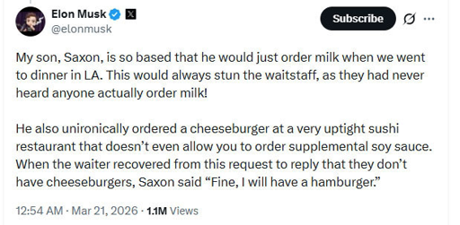 Edit: To prove this isn’t satire ragebait – https://xcancel.com/elonmusk/status/2035263787801174366