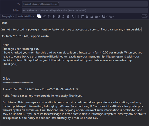 northernlights@lemmy.today to Mildly Infuriating@lemmy.worldEnglish · 23 days agoAsked LA Fitness to cancel my membership, they offered to freeze it for $10/month insteadlemmy.todayimagemessage-square210linkfedilinkarrow-up1832arrow-down16file-text