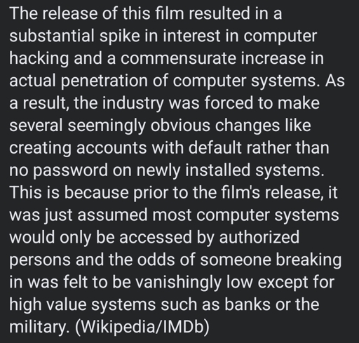 minus-squareUriel238 [all pronouns]@lemmy.blahaj.zonelinkfedilinkEnglisharrow-up1·2 years agoWargames is the one that scared President Reagan and created the (still overreaching) CFAA. That said, at 300 baud, hacking was s . . . . . l . . . . . o . . . . . . . . . . w.