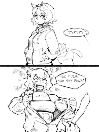 transcription: disembodies hand: “pspsps” buff catgirl: “the fuck you say punk!”