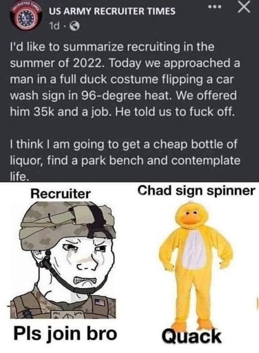 Flip a sign or spend the rest of your life thinking about the time you were ordered to incinerate a hospital full of elderly and children and wake up in a cold sweat every time you hear a loud noise, and have to fight the VA office for every penny of benefits you were promised for becoming one of Earth’s most horrible monsters while watching your friends get blown apart in bloody chunks.