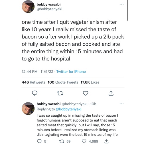 minus-squarenailingjello@lemmy.ziplinkfedilinkarrow-up40arrow-down6·1 month agoYou know what they say… Either you like bacon, or you’re wrong.