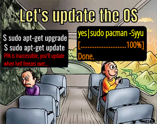 I’m getting used to arch on my main desktop and I still can’t figure out why the hell “sync” is the wording pacman uses for updating or why ‘y’ is refresh. Sync refresh upgrade my ass. I will admin, it is fast.I did it on the GUI all day yesterday! The only problem Debian has is being unbreakable!