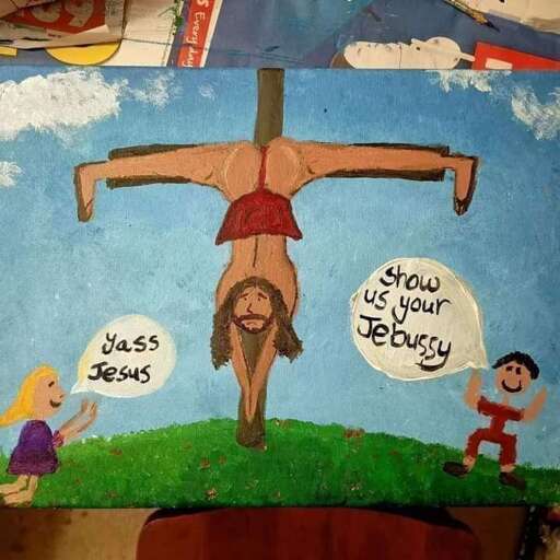 I know Christ became a symbol for some very evil people, but like, cmon, making fun of a brutal execution? Hell naw