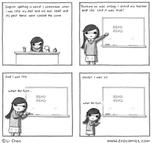 It’s not saying anything about past tenses in that meme, it’s just saying that each word has two different pronunciations that rhyme with the other.