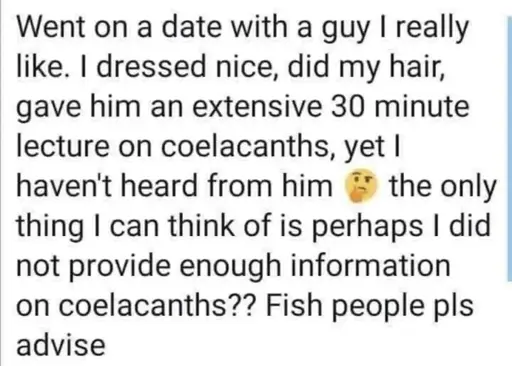 Yeah you gotta leave them wanting more. If you give up the coelacanth on the first date, he doesn’t have a reason to come back for a second date.