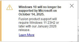 **What does end of support mean for Windows 10 and Fusion?** Fusion will continue to work on Windows 10 after the 14th - however, Autodesk will no longer consider Windows 10 for validation, bug fixing, and product support of future releases. Application compatibility and support will not be guaranteed for this platform for releases after this date.
