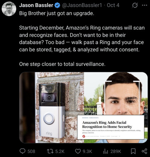 The depressing part is that even if you don’t own or use Ring, you will be in their database because those cameras are everywhere. The populace has completely given up all their privacy and have done it willingly.