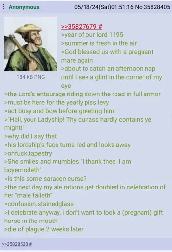 In this case, the implication is that the local “Lord” has been collecting pregnant mare urine to extract feminizing hormones for ye olde HRT, and is embarrassed and happy that it is apparently working, since the peasant saw her as a lady.