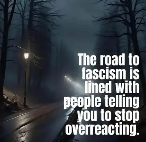ID: photo of a dark road through some woods, in the lower right is text saying “The road to fascism is lined with people telling you to stop overreacting.”