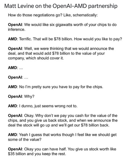 The common weak link in all of these circular financing deals is OpenAI. Except on this one, where AMD is the weaker side. Of course this makes the banksters pump AMD stock. People like to shout AI/LLM bubble, but OpenAI and MechaHitler going for Skynet is going to get a lot of powerful sustain. Still, Skynet ambition is opposite of best path to making money/useful models until US/Israel military payday.